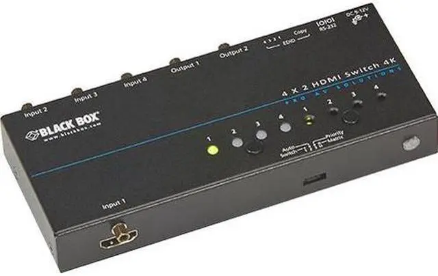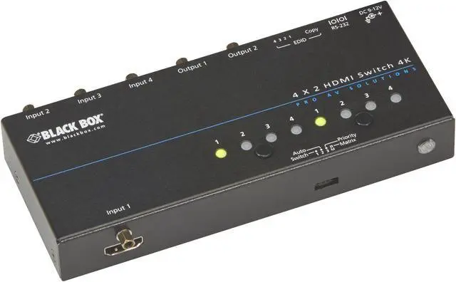 Contents: 4K HDMI Matrix Switch - 4 x 2 1 x IR Remote Control 1 x RS-232 Cable 1 x 12V 1.5A Power Supply with Cord User