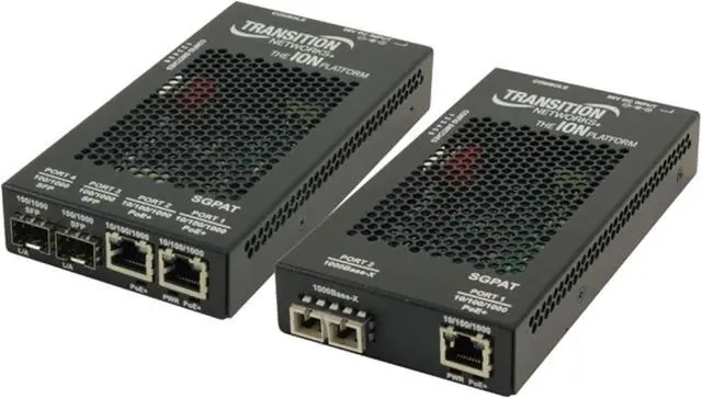 The SGPAT10xx-105 is a 10/100/1000Base-T to 1000Base-SX/LX Gigabit Ethernet Media Converter, which easily and affordably facilitates the connection between different types of network cabling, while also injecting PoE+ power through the copper RJ-45 port. Being a Power Sourcing Equipment (PSE) device, the SGPAT media converter combines data received over a fiber optic link with 56VDC input power to provide power and data to a Powered Device (PD) over twisted pair cabling while complying with the IEEE 802.3at PoE+ standard, which is also backwards compatible with the IEEE 802.3af PoE standard. The converter is available in 2-port, 3-port, and 4-port versions and includes PD signature sensing and power monitoring features. Other features include over-current protection, under-current protection, and fault protection input. Active Link Pass Through (ALPT) is supported, which is an automatically activated version of Link Pass Through (LPT) that allows the converter to detect the loss of Receive (Rx) signals on either fiber or copper port and propagate the failure to the end devices, preventing the media converter from isolating those link failures. During a Link Pass Through event, the Auto Power Reset feature will re-set the power to the end PD device, ensuring it is ready to go when the LPT event is corrected. Main Features 3-port version offers (1) RJ-45 PoE+ port and (2) open SFP slots, device can be configured as a 3-port switch or as a 2-port media converter with redundant fiber links 4-port version offers (2) RJ-45 PoE+ ports and (2) open SFP slots, device can be configured as a 4-port switch (with or without redundant fiber) or as two independent PoE+ media converters SFP slots can support 100Base-FX, 1000Base-X, or SGMII based (MSA compliant) SFP modules Supports Auto-Negotiation, Auto MDI/MDI-X, Active Link Pass Through (ALPT), and Remote Fault Detection Jumbo frame support