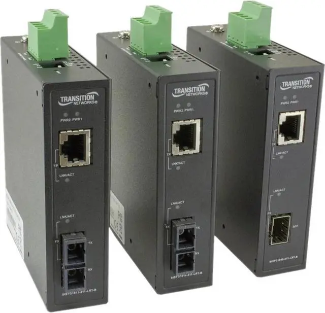 10/100/1000Base-T (RJ-45) [100 m/328 ft.] to 1000Base-SX 850nm multimode (SC) [62.5/125 m: 220 m/722 ft.] [50/125m: 550 m/1804 ft.] Link Budget: 8.5 dBThe SISTG10xx-211-LRT-B Series is a new generation of unmanaged hardened Gigabit Ethernet media converter. The converter can provide multimode or single mode fiber connections with fixed SC connectors for extending the Ethernet service distance over fiber. The converter also has a SFP version that provides the ultimate flexibility to choose the appropriate SFP module to match your communication and distance needs. It has redundant input power connections to ensure safe reliable operation in temperatures between -40°C and +75°C. Transition Networks' hardened switches are certified with UL Class 1 Division 2 to operate reliably in hazardous locations such as Oil & Gas, manufacturing, and the chemical industry. Main Features Reverse Polarity Power Input Protection Overload Current Protection DIN Rail Mounting Brackets Included Class 1, Div 2 Certified Jumbo Frame: 9K bytes