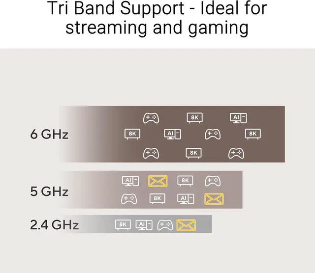 Ideal for Streaming and Gaming - Support for tri-band, including 6GHz frequency spectrum, automatically selects the best band for stable connections and superior performance