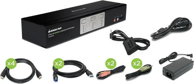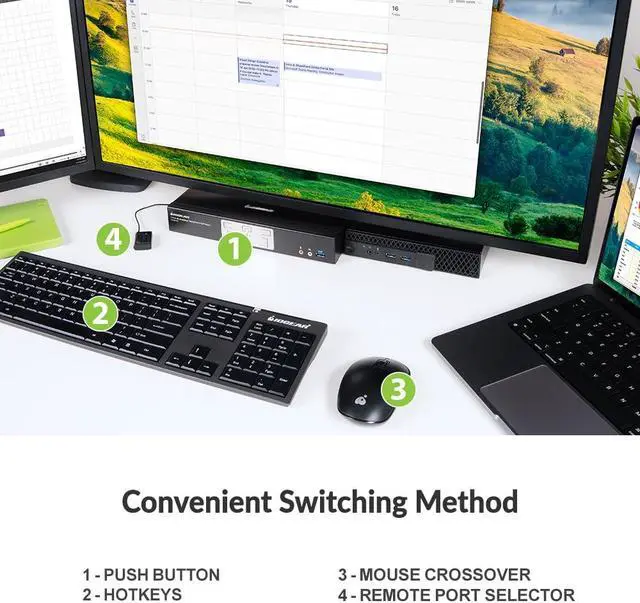 One USB keyboard, mouse and two monitors control two DisplayPort computers and two USB peripherals