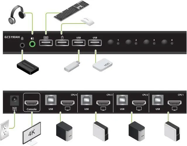 Control up to 4 PCs from a single monitor, keyboard, mouse, speaker and up to 2 USB peripherals. Superior video quality up to 4096x2160 @60 Hz or 5120x1440 @60Hz (HDMI 2.0)