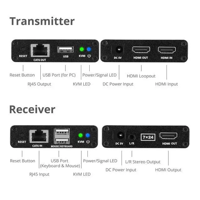 On Transmitter (TX) - One HDMI input, one HDMI loop-out, DC power (5V/1A), USB 2.0 (PC host), RJ45 output, and a reset buttonOn Receiver (RX) - One HDMI output, one stereo audio output (L/R), DC power (5V/1A), two USB 2.0 ports (keyboard and mouse), RJ45 input, and a reset button.