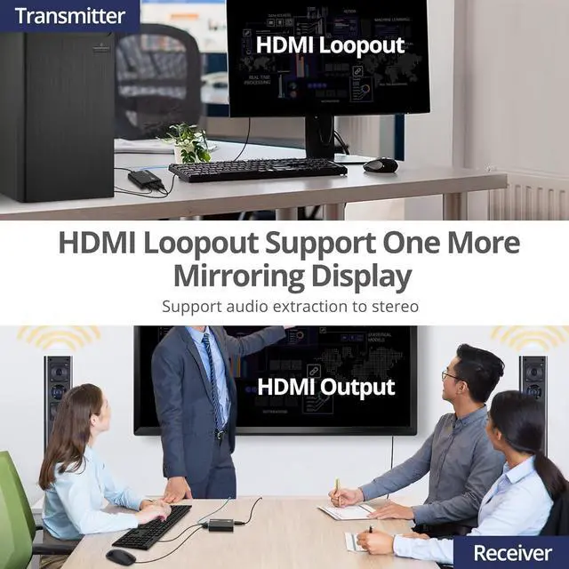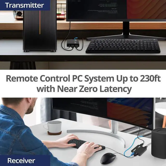 This multifunctional HDMI KVM Extender over Cat 6/ 6a/ 7 ethernet cable connects your computer/ devices to a remote workstation or location. It transmits HDMI video and audio, as well as USB 2.0 signals up to 230ft, with near zero latency.