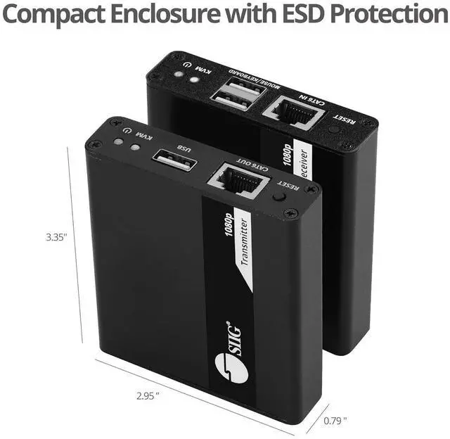 Video Resolution 1080p / 1080i / 720p / 480pTransmission Distance 1080p up to 230ft (70m) via Cat6/ 6a/ 7 cableHDMI Audio formatPCM 2/5.1/7.1, Dolby & DTS 5.1 CH3.5mm Audio formatPCM 2CH (L/R audio extraction)Transmitting Unit (TX)Dimensions: 3.35" (W) x 0.79" (H) x 2.95" (D)/ Weight: 0.29 lbsConnectors1x 19-pin HDMI Input1x 19-pin HDMI Loop-out/ 1x 4-pin USB 2.0 Type-A for Host connectionConnectors1x 8-pin, RJ45, Output/ 1x Reset button/ 1x Power jackReceiving Unit (RX)Dimensions: 3.35" (W) x 0.79" (H) x 2.95" (D)/ Weight: 0.29 lbsConnectors1x 19-pin HDMI Output/ 2x 4-pin USB 2.0 Type-A connect to Keyboard & Mouse/ 1x 8-pin RJ45 InputConnectors1x 3.5mm (L/R) Audio/ 1x Reset button/ 1x Power jackUnit packageDimensions: 7.83"(W) x 3.15"(H) x 5.87"(D)/ Weight: 1.42 lbsPower adapterInput: 100-240V / 50-60Hz Output: DC 5V/1AHousing materialAluminum alloy with crystal panel Founded in 1985, SIIG Inc. has led the way in creating IT and AV connectivity solutions you can trust. Focused on user satisfaction, we are driven by our core values of integrity, dependability, and innovation.
