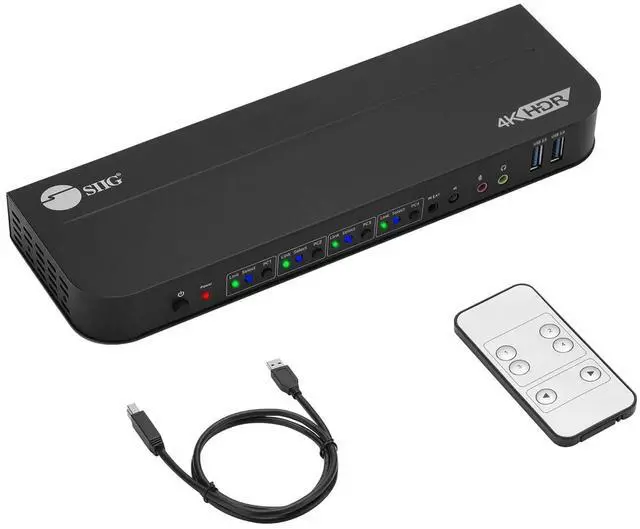 DisplayPort KVM Switch - SIIG's CE-KV0D11-S1 KVM switch allows you to switch between 4 computers with one set of keyboard and mouse. Simply connects two DisplayPort video sources to one single monitor with DP or HDMI port. There are 2 USB 3.2 Type-A ports for USB peripherals like printers or external hard drives and 2 USB 2.0 Type-A ports for keyboard and mouse. The 3.5mm audio jack is handy for the speaker and microphone.