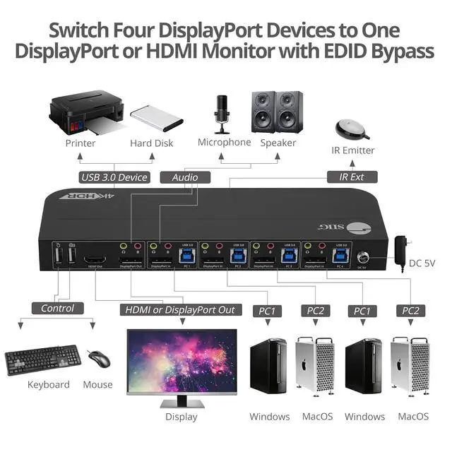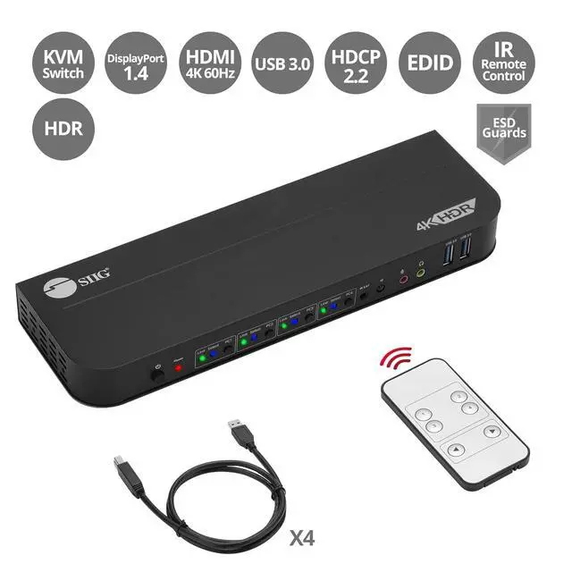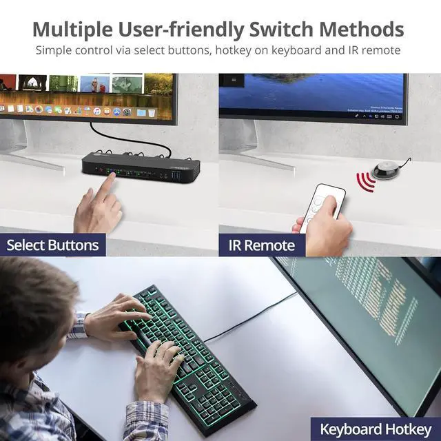 Easily Switch between 4 Computers - Using this DisplayPort KVM switch, you can freely switch between 4 computers in different ways like, push-button, keyboard hotkeys, or the IR remote control included in the package.