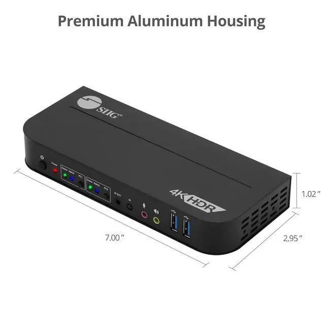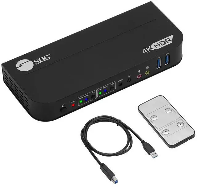4K HDMI KVM Switch - SIIG's CE-KV0E11-S1 KVM switch allows you to switch between 2 computers using one keyboard and mouse. Simply connects 2 HDMI video sources to a single display via this KVM switch. There are 2 USB 3.2 Type-A ports for USB peripherals like printers or external hard drives and 2 USB 2.0 Type-A ports for keyboard and mouse. The 2x 3.5mm audio jacks are handy for the speaker and microphone.