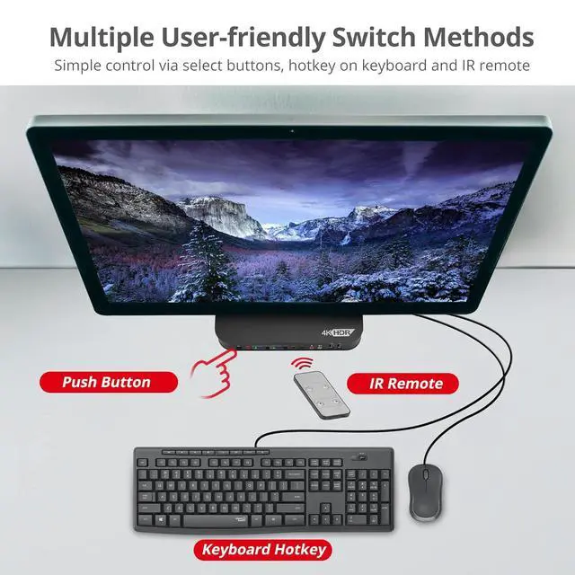 Easily Switch between 2 Computers - Using this HDMI KVM switch, you can freely switch between 2 computers in different ways like, push-button, keyboard hotkeys, or the IR remote control included in the package.