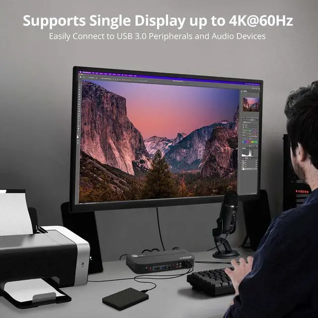 Connect to Your USB peripherals - The HDMI KVM switch comes with 2x USB 3.2 Gen 1 Type-A ports that offer data transfer rate of up to 5Gbps, so you can connect those USB devices, such as pen drives, flash disks, or printers. 2x USB 2.0 ports are also available on the KVM for wired or wireless keyboard and mouse. Note: For wireless keyboard and mouse, we recommend using an additional USB extension cable to connect to the USB port for the dongle.