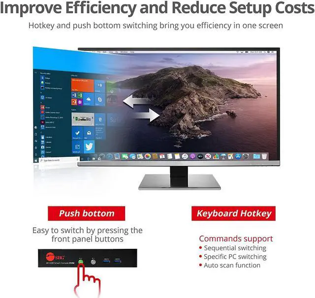 Plug-and-play: plug-n-play, no driver installation. Easy system selection via front panel selection buttons or user programmable keyboard hot-key commands