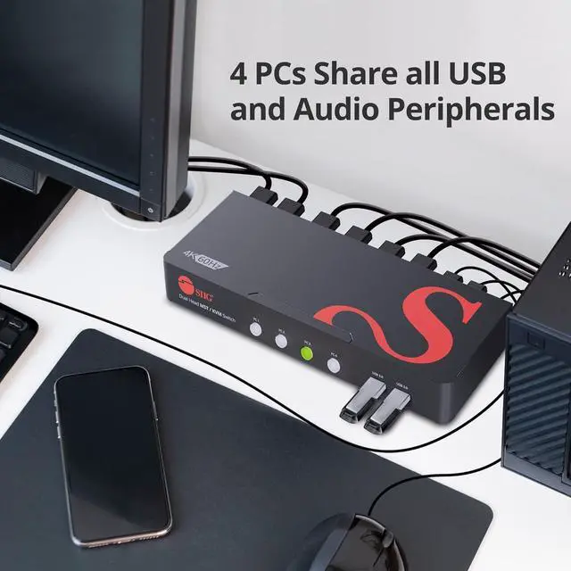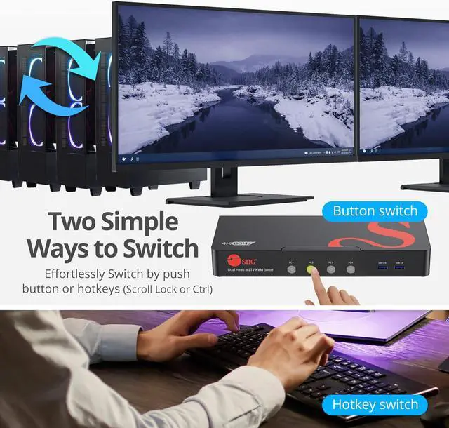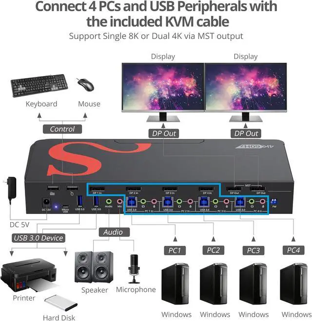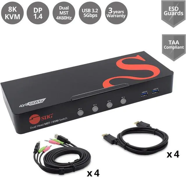 Easily switching between computers/devices via the front panel push button or USB keyboard hotkeys make this DisplayPort 1.4 4K Smart Console KVM Switch with 4x USB 3.2 Gen 1 Ports, Multi-Media user-friendly to operate