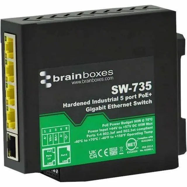 Brainboxes Hardened Industrial 5 Port PoE+ Gigabit Ethernet Switch SW735
