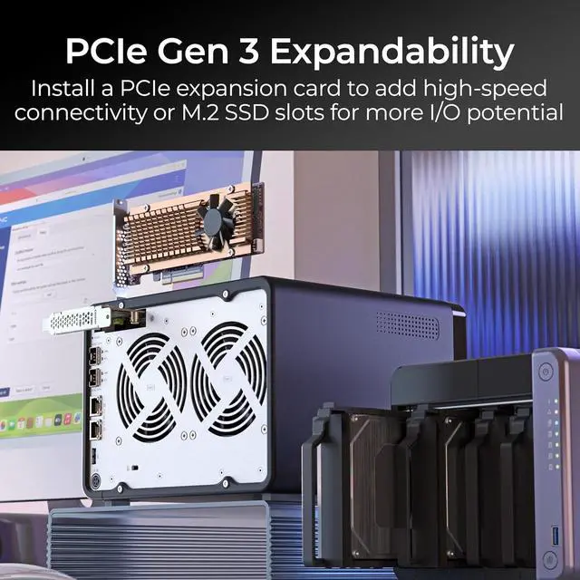 • Single PCIe Gen 3 x4 expansion card to add 2.5/5/10GbE connectivity or M.2 SSD slots to the NAS for more I/O potential