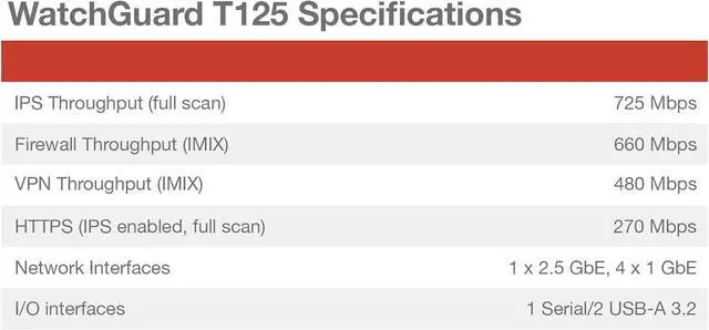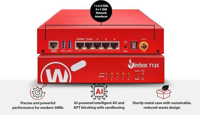 Watchguard T125 Firebox with 1 Year Standard Support License (WGT125001) - The Firebox T125 provides enterprise-grade protection for branch offices and remote sites. Featuring 2.5Gb and 1Gb ports, it delivers fast throughput, advanced malware detection with IntelligentAV, and SD-WAN compatibility in a compact form factor.