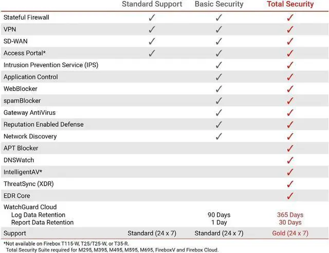 Standard Support covers software updates and round-the-clock emergency help. Add a Basic or Total Security Suite to activate IPS, gateway antivirus, and web filtering so threats are blocked before they reach users.