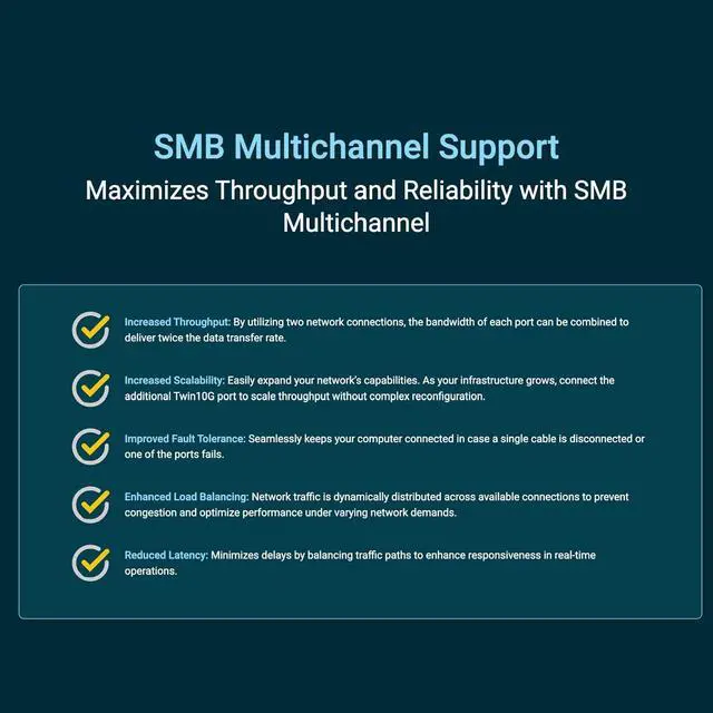 Increased Throughput: By utilizing two network connections to SMB Servers, the bandwidth of each port can be combined to deliver twice the data transfer rate.