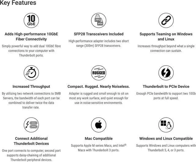 Adds High-performance 10GbE Fiber Connectivity: Simply powerful way to add dual 10GbE fibre connections to your computer with Thunderbolt ports.