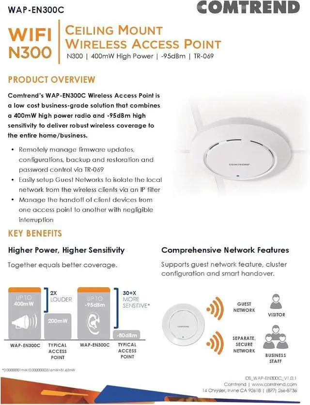 Comtrend's WAP-EN300C Wireless Access Point is a low cost business-grade solution that combines a 400mW high power radio and -95dBm high sensitivity to deliver robust wireless coverage to the entire home/business.