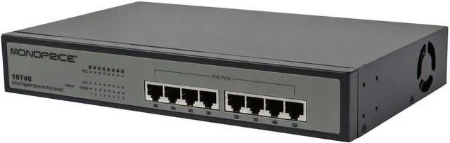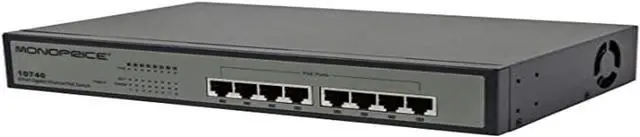 Distribute data and power to your Power over Ethernet (PoE) devices using this 8-port Gigabit Ethernet PoE Switch from Monoprice. This switch is fully compliant with the IEEE 802.3, 802.3u, and 802.3ab standards for 10Base-T, 100Base-TX, and 1000Base-T communications. It features eight 10/100/1000 Mbps RJ45 Gigabit Ethernet ports, each of which is designed to the 802.3af and 802.3at standard to carry both data and up to 30 watts of power for use by PoE equipped Access Points, IP Phones, IP Cameras, etc. The switch can deliver a total of 120 watts of power across all eight PoE/data ports. The switch supports all the standard features for Gigabit Ethernet switches, including 802.3x flow control and a 4K auto-learning/auto-aging MAC address table. Features: . 8 10/100/1000Mbps Auto-Negotiation RJ45 ports, all with PoE functionality Complies with IEEE 802.3at/af standards Supports PoE power up to 30W for each PoE port, 120W for all PoE ports Supports PoE+ IEEE 802.3at/af compliant Powered Devices (PD) Supports 4K MAC address table, MAC address auto-learning auto-aging Supports IEEE 802.3x flow control for Full-duplex mode, Back-pressure flow control for Half-duplex mode ports Plug and play, no configuration required Power MAX LED to monitor the PoE power status Steel desktop design, with internal power supply