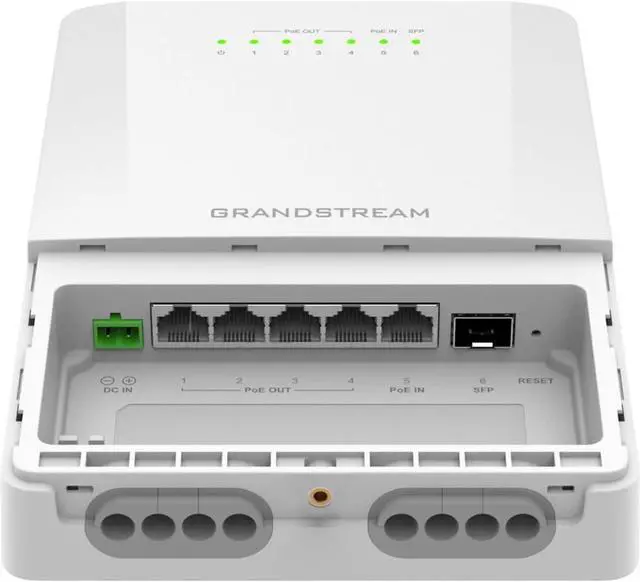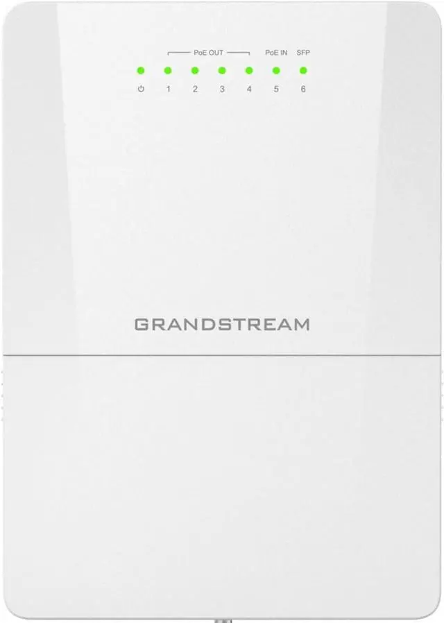 The GWN7710R is a 6-Port (5GE+1SFP) outdoor lite managed PoE switch that features an IP66-rated waterproof and dustproof casing to protect against harsh weather conditions, including rain, snow, and high temperatures.