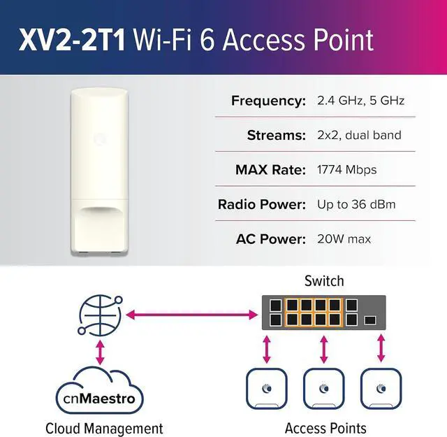 Cambium Networks' Wi-Fi Access Points can be easily deployed and managed with cnMaestro, a cloud-based software platform for secure, end-to-end network control. This program simplifies device management by offering full network visibility and zero touch provisioning.