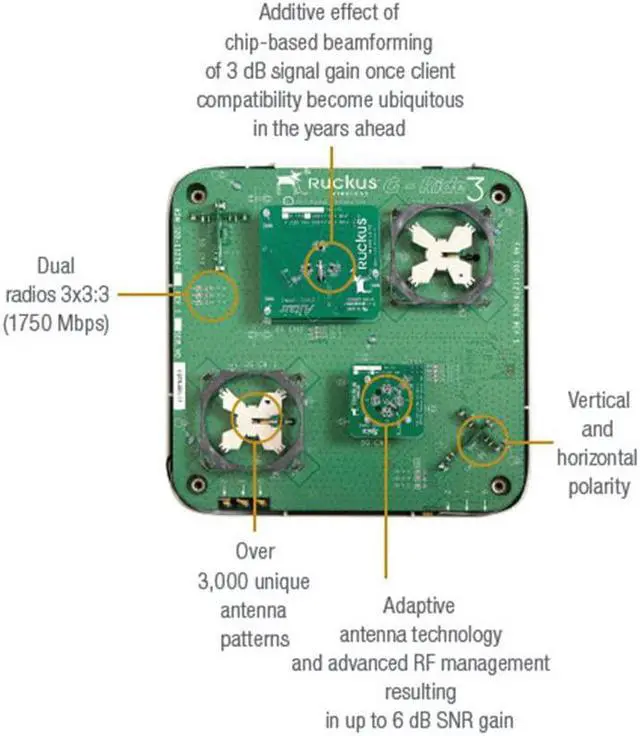 Capable of supporting over 500 clients, Automatic interference mitigation, optimized for high-density environments, Dual polarized adaptive antennas with 21 antenna elements and over 3000 antenna patterns for ultra-reliability
