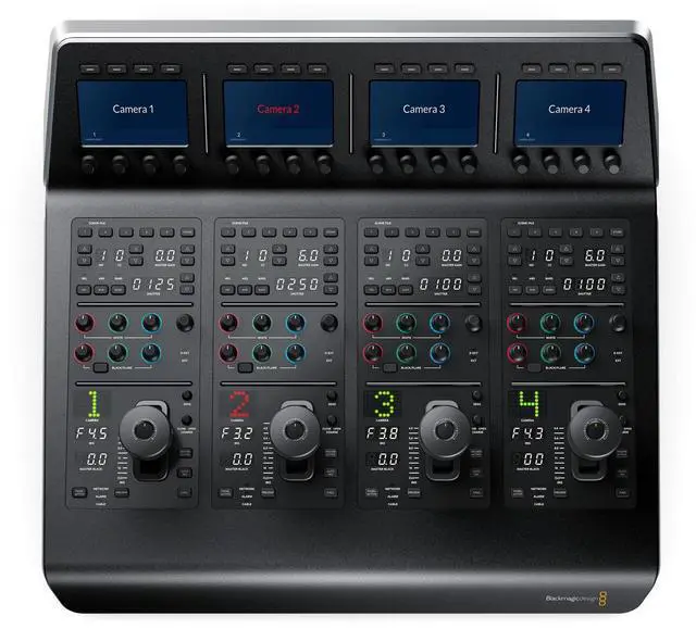 The ATEM Camera Control Panel stands out with its four camera controllers, each housed within a single, user-friendly panel. Each controller features a large LCD screen, soft buttons, and knobs at the top, along with a full set of professional controls on the main body. This eliminates the need for multiple devices, streamlining your workflow and enhancing your efficiency.