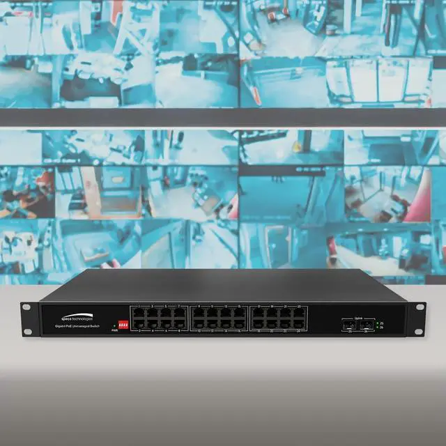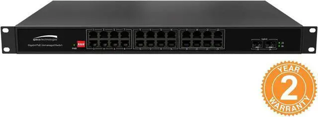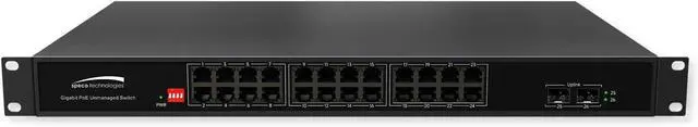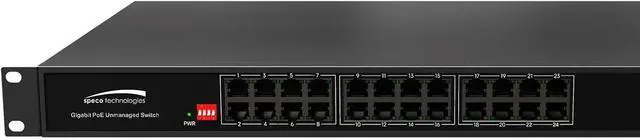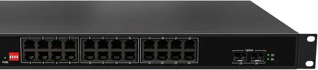 Gigabit network switch features (24) 10/100/1000Mbps PoE ports and (2) shared SFP Gigabit optical ports