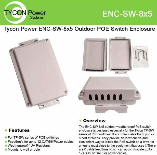 The ENC-SW-8x5 outdoor weatherproof PoE switch enclosure is designed especially for the Tycon TP-SW series of PoE switches. It accommodates the 5 port or 8 port switches. They provide an inexpensive and convenient way to locate the PoE switch on a tower or antenna mast close to the equipment that uses it.