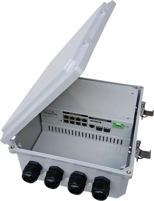 The LinkPower LPS1800AT-T1 Outdoor Fast Ethernet PoE Switch Series offers 10-Port 10/100Mbps unmanaged IEEE 802.3 at/af PoE (Power over Ethernet) Network Switch with 8 10/100Mbps PoE Ports and 2-Combo Gigabit SFP/RJ45 Combo Port and is the industry first outdoor weatherproof industrial 10/100Mbps Ethernet switch that delivers data and power up to 30W DC per PoE port over one single network cable protected with an IP68 compliant weatherproof enclosure. The outdoor weatherproof rating of the systems is strictly based on how the top cover is closed. For the hinged cover without the four top cover screws, the outdoor weatherproof rating is IP66 and, otherwise, the outdoor rating is IP68 with the four top cover screws securely closed with the enclosure.