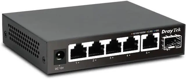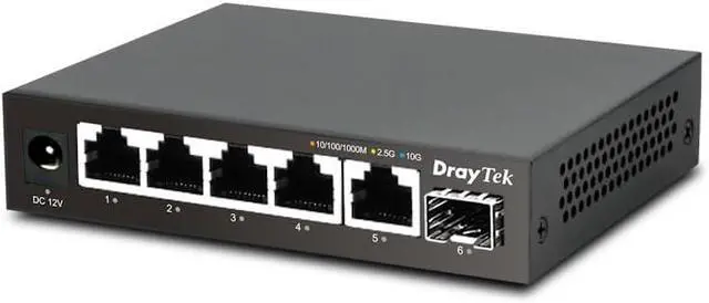 VigorSwitch Q60x is a small, high-performance unmanaged 2.5 Gigabit Ethernet switch with 5 x 2.5-Gigabit RJ-45 LAN ports and 1 x 10-Gigabit SFP+ port. Use the faster 2.5 GbE ports for high-speed connections between switches, servers, and wireless access points such as the VigorAP 805. The 10Gb SFP+ interface can be an ideal option for uplink purposes to connect to a router or another switch. Our lightweight, low-power network switch is easy to deploy. This VLAN-aware device requires no configuration, offers fanless operation, and comes with a power supply.