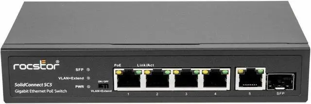 The Rocstor SolidConnect SC5 is a feature-rich 5-Port PoE+ Gigabit Unmanaged Ethernet Switch with an additional 1-Port Gigabit Ethernet SFP, making it a professional-grade solution for various networking needs. SC5 conforms to IEEE 802.3x, IEEE 802.3, IEEE 802.3u, IEEE 802.3ab, IEEE 802.3af, and IEEE 802.3at standards, ensuring compatibility and adherence to industry benchmarks. This versatile switch supports desktop, rackmount, and wallmount configurations, providing flexibility in deployment. Boasting a total of 5 x 10/100/1000 RJ-45 ports, including 4x Gigabit PoE Ethernet Ports for the transmission of power and data, and an additional 1-Port Gigabit RJ45 Uplink and 1-Port Gigabit SFP Uplink for data transmission, it offers robust connectivity options for a range of devices. Each PoE+ port supports up to 30W, with a generous total power budget of 62W, ensuring ample power for high-demand applications such as security cameras or access points. The SC5 is designed for reliability with a 2-layer supported architecture, housed in a rugged metal enclosure that guarantees durability in diverse environments.