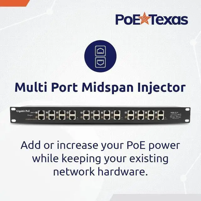 Power over Ethernet delivers power 328 feet from the PoE injector, eliminating the expense and hassle of installing AC power near your powered device. Use this midspan injector to add PoE to an existing ethernet cable: 1 data port in + 1 PoE port out. Or you can use the injector to increase the amount of PoE available to network devices downstream, without altering your upstream PoE switch equipment or network configuration. Our PoE injector adds power, but unlike a switch, does not manage data. Each PoE out port has its own Data In port with a total of 12 + 12 available on the multi port unit.
