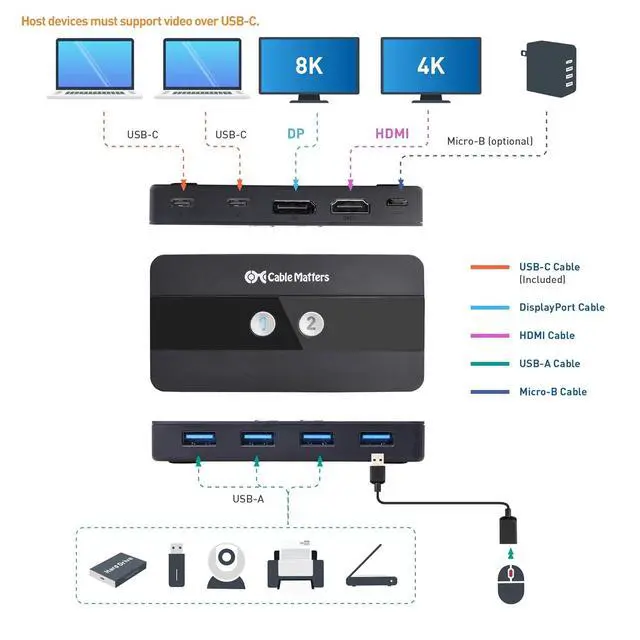 The Cable Matters USB-C KVM Switch is the ultimate one-cable KVM that does it all over USB-C. Share dual 4K monitors, plus high-speed USB 3.0 and USB 2.0 peripherals between two computers. Eliminate the need for separate pairs of monitors, keyboards, mice, printers for each computer. Easily swap laptops in and out of your workspace without having to unplug multiple USB and monitor cables.