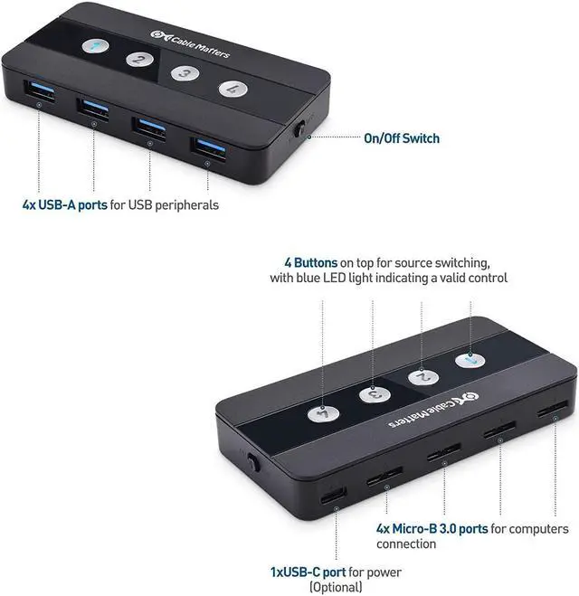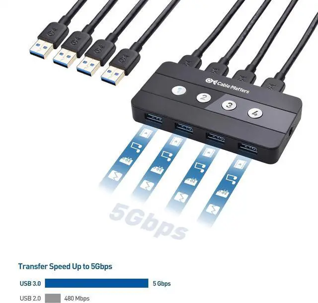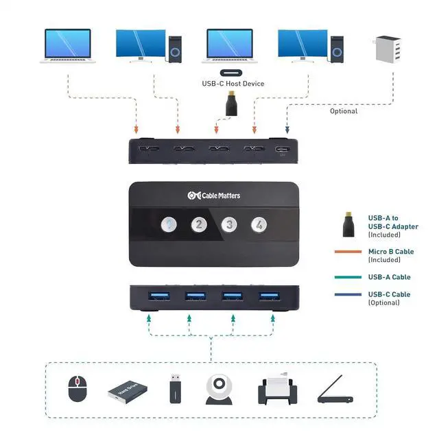 The bundle includes the Cable Matters remote controlled USB KVM; USB switch 4 computers shares up to 4 USB 3.0 peripherals with up to 4 different computers; Swap USB keyboards, mice, hard drives, and other peripherals between computers with the push of a button