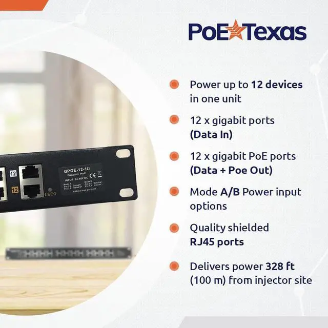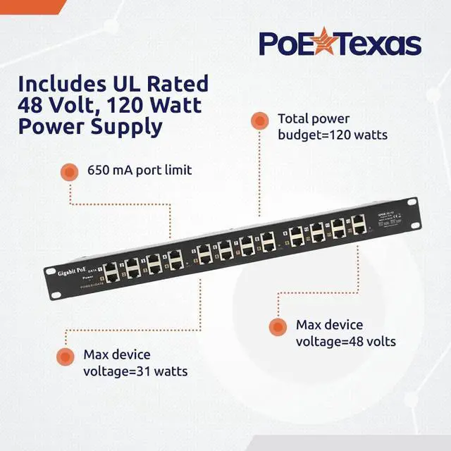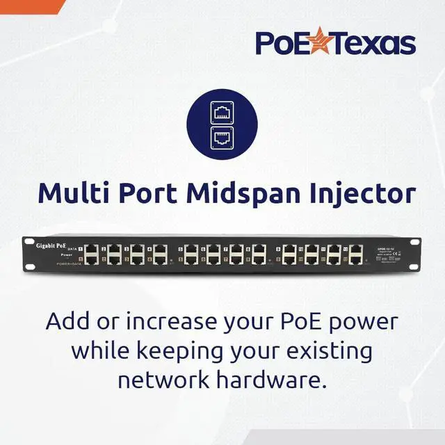 PoE Texas - PoE Injector - 12 Port Gigabit Passive Midspan Injector with 48V 120 Watt UL Power Supply - Power Over Ethernet for 802.3af or at (PoE+) Devices VoIP Phone, WiFi Access Point, IP Camera