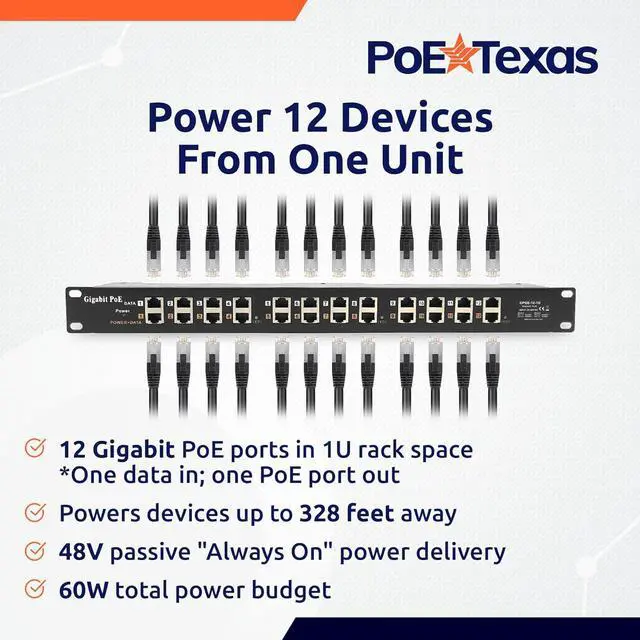 Our 12-Port Gigabit PoE Injector streamlines your network by powering up to twelve devices through standard ethernet cables. It delivers 48V passive power up to 328 feet away, eliminating the need for individual power outlets.