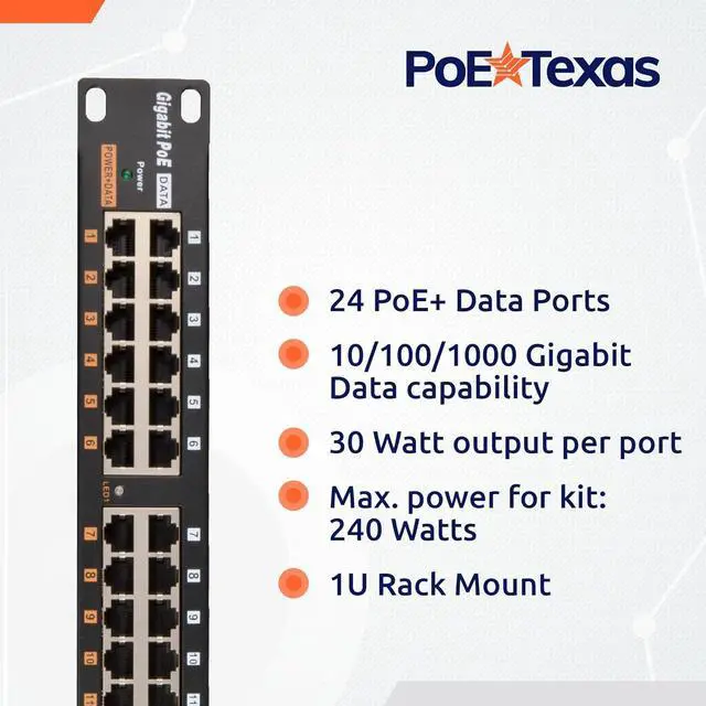 Plug and play. Our 24 port PoE adapter / injector transmits 10/100/1000 gigabit data, delivering lightning fast wired speeds with no loss of signal quality, up to 328 feet. Input voltage range: 48-56 Volts DC. 30 Watt output per port.