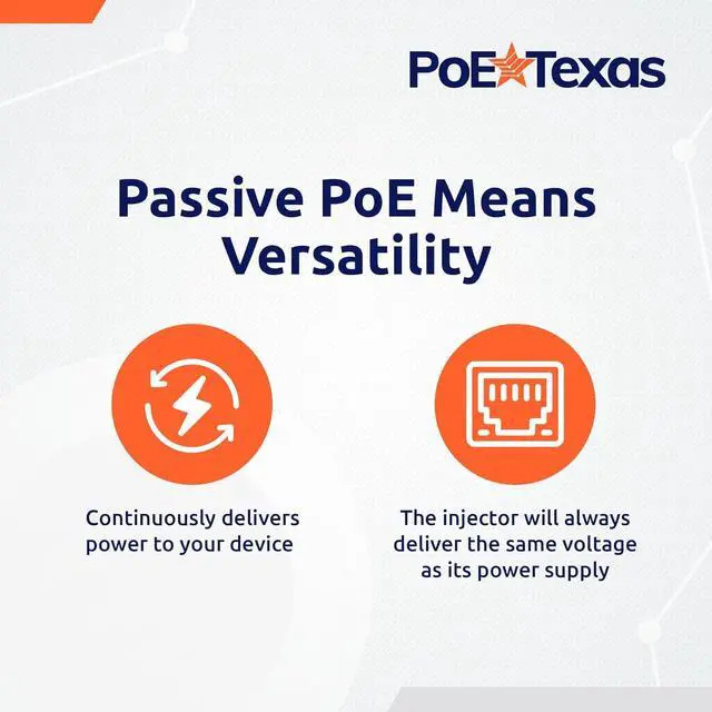 With this passive PoE Injector, you can add power to your data cable for a fraction of the cost of upgrading to a PoE capable network switch. Passive PoE power is Always On with power delivery on Mode B pins (-4,5 +7,8).