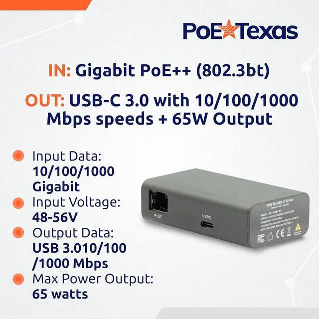 Power and charge your USB-C device with secured wired ethernet at gigabit speeds. Provides a working solution for installing tablets, kiosks and schedulers where you need them using PoE technology. Compatible with an IEEE 802.3bt PoE++ switch or injector (sold separately).