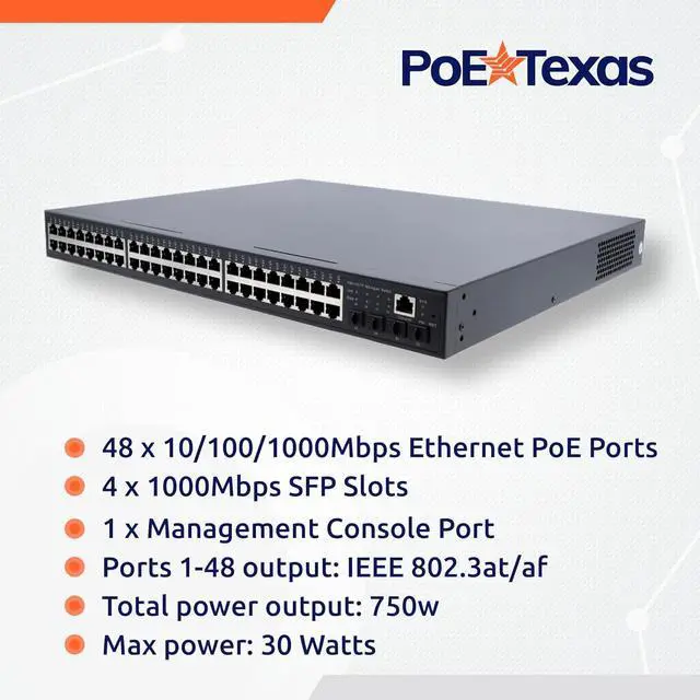 This gigabit PoE switch features 48 x 10/100/1000Base-T Ethernet PoE ports and 4 x 1000Base-X SFP Slots. Ports 1-48 output IEEE 802.3at/af. The total PoE power budget is 750W. Max power for a single port is 30W. Includes an on-board power supply.