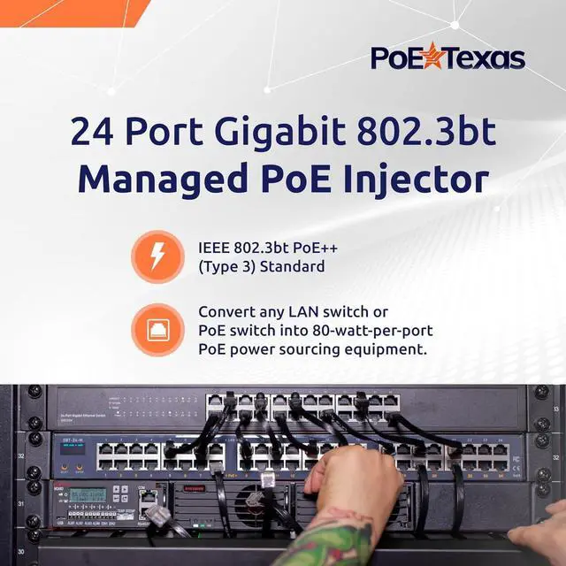 The 24-port gigabit injector adds high power PoE to your network without altering infrastructure. No need to purchase a larger 24 port switch. You can rely on a smaller, more cost-effective switch and simply add the Power + Data you need using this 802.3bt PoE power injector.