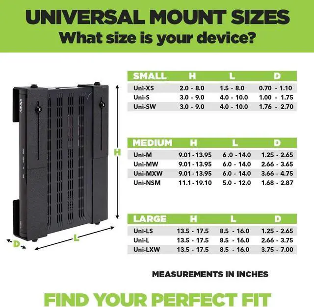 ADJUSTABLE FIT. The HIDEit Uni-NSM Wall Mount is adjustable to fit a variety of networking devices, including most that would typically fit in a 1U server rack. Check the device's dimensions to ensure a snug fit. Height: 11.1-19.1", Length: 5-12", Depth: 1.68-2.87".