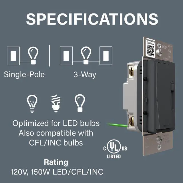 DIMMABLE LED COMPATIBLE: Specifically designed for use with dimmable LED bulbs and fixtures up to 150W at 120VAC, optimized for flicker-free control right out of the box
