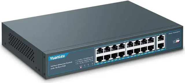 Port and rateIncludes 16 POE ports (10/100Mbps) and 2 Gigabit UpLink port (1000Mbps). The 2 Gigabit Uplink can support more bandwidth and network.