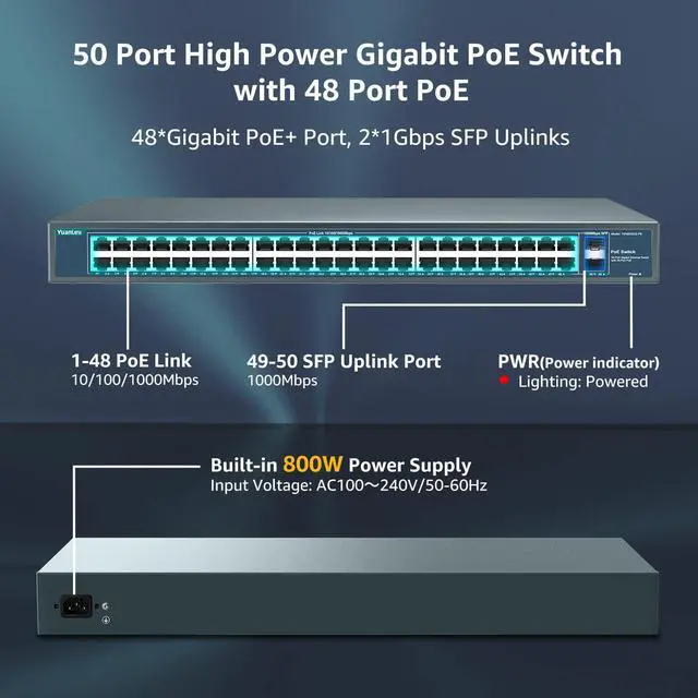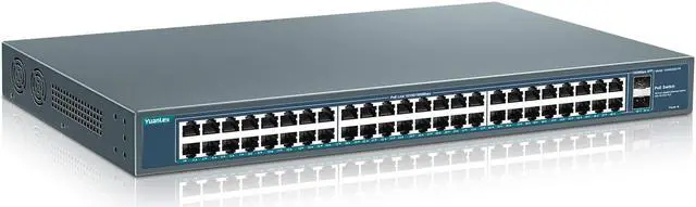 48 Port Gigabit PoE+ SwitchIncludes 48x10/100/1000Mbps PoE+ RJ45 Ports, 2 Gigabit UpLink SFP Port. SFP ports could be connected different devices such as routers, NVRs, etc. Widely used in IP cameras, Wireless Access Point, IP Phone, Computer Networks, etc..