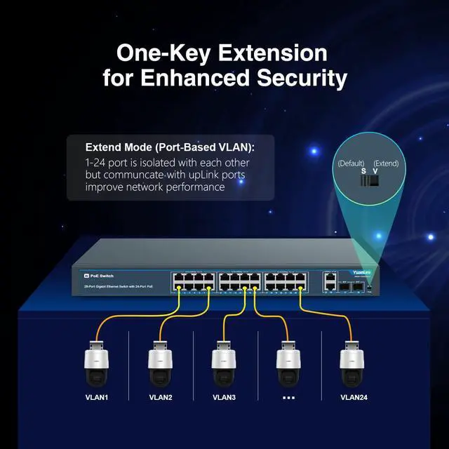 VLAN SwitchPoE ports will be isolated respectively but can communicate with uplink port, Better Network Bandwidth up to 56 Gbps with higher Security. Ideal for PoE IP Camera, EAP, Access Point, IP Phone and other PD devices.