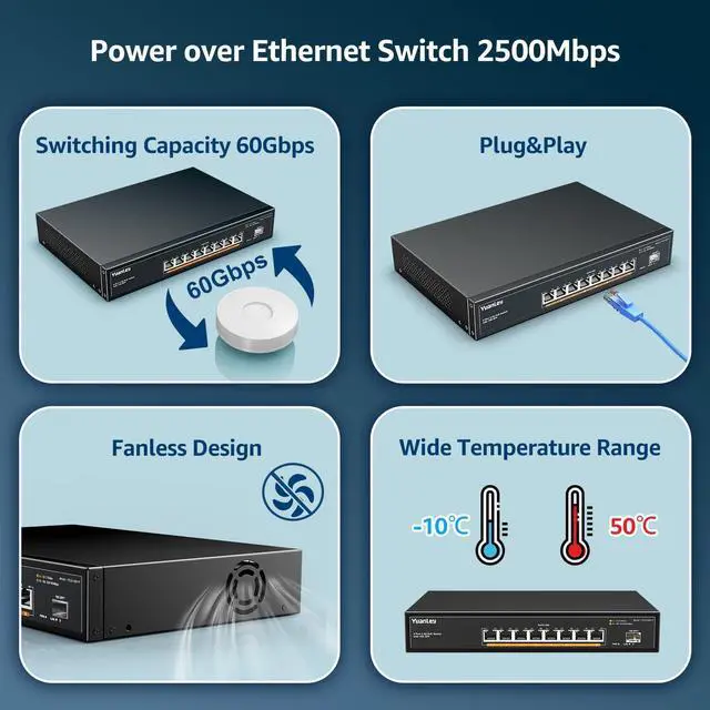 AC: 100240V 50-60HzLightning Protection6KV This ItemYuanLey 9 Port 2.5G PoE Switch Unmanaged, 8 x 2.5G Base-T PoE Ports, 10G SFP, IEEE 802.3 af/at, 120W, Compatible with 100/1000/2500Mbps, Metal Fanless, Desktop/Rack Mount 2.5G be Network SwitchRecommendationsMokerLink 8 Port 2.5G PoE Switch with 10G SFP+ Slot, 8 x 2.5G Base-T Ports Compatible with 10/100/1000Mbps, IEEE8023af/at PoE 135W, Metal Unmanaged Fanless Small Network Switch TEROW 8-Port 2.5G b POE Switch with 1*10Gb SFP Uplink, Featuring 9* 2.5G PoE Switch, Base-T POE Ports, IEEE 802.3 af/at, 120W, Compatible with Gigabit, Metal Fanless, Desktop/Wall Mount, 2.5G be Ethernet SODOLA 8-Port Unmanaged 2.5G Switch, 8 x 2.5GBASE -T Ports, 1X10G SFP+, 100Gbps Switching Capacity, Fanless, MetalPlug & Play 2.5G b Network Switch 8 Port 2.5G PoE Switch Unmanaged with 8 x 2.5G b Base-T @120W + 10G SFP Uplink, 2.5G be IEEE 802.3 af/at Power Over Ethernet Switch, Support WiFi6 AP, NAS, 4K PoE Camera NVR. 10 Port 2.5G b Unmanaged Ethernet Switch with 8* 2.5G Base-T Ports, 2* 10G SFP+ Ports. GiGaPlus 2.5G bps Network Switch for 2.5G bps NAS/PC, WiFi6 Router, Wireless AP.