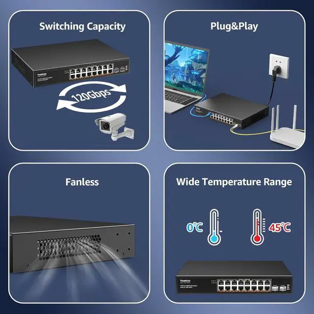 400W Total PoE Power Support IEEE 802.3af/at PoE power supply. The whole power is 250W, up to 30W per port. Suitable for poe power supply for multiple devices. 2.5x faster than Gigabit Switch, provided 160Gbps switching capacity, higher and faster configurations.